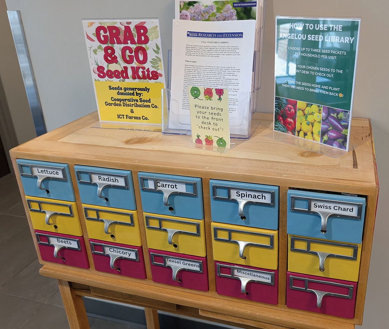 The seed library enables library card holders to “check out” seed packets to grow their own produce at home. The popularity of the seed library inspired the new community garden at the Maya Angelou branch.