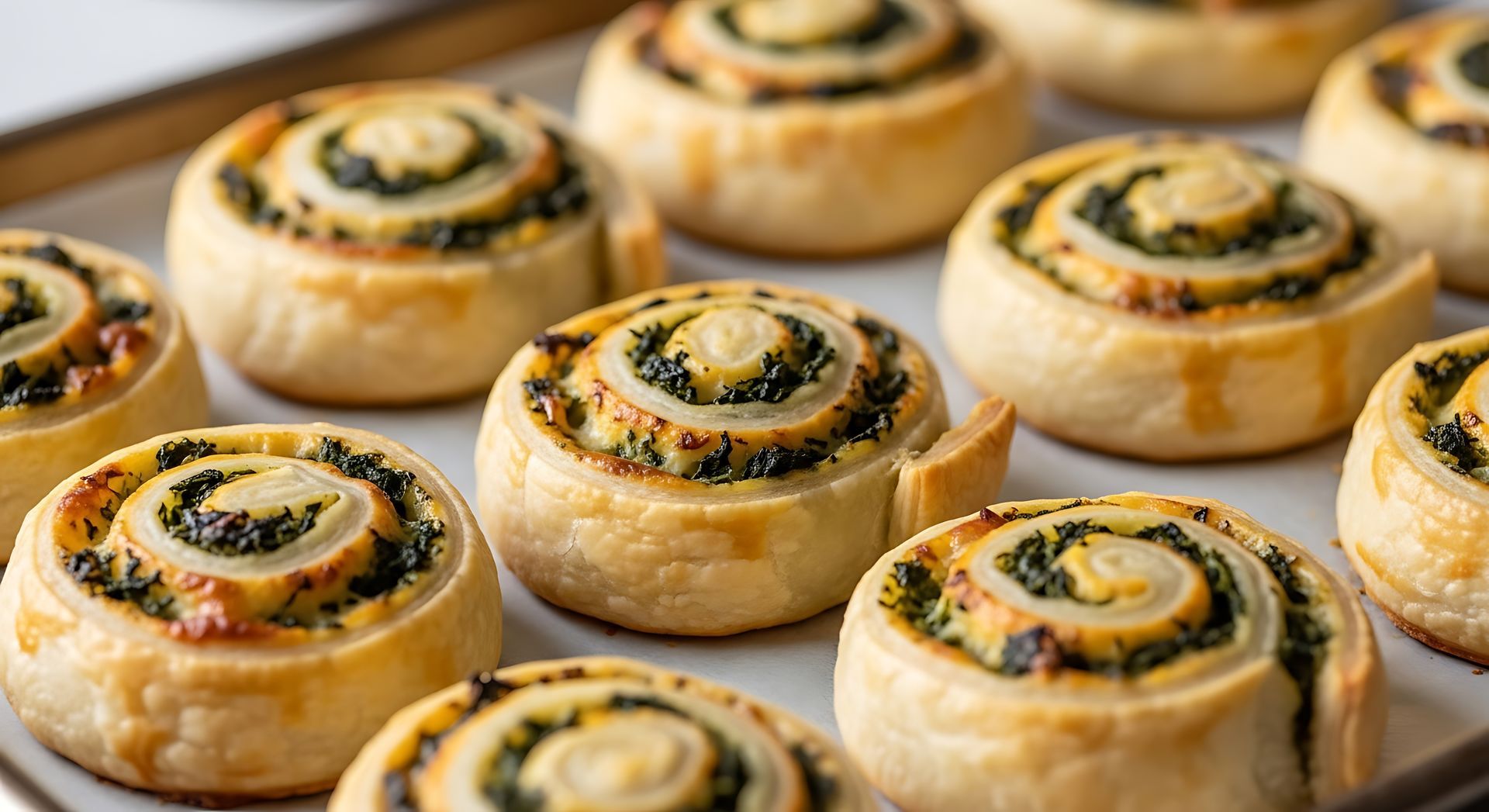 Preheat the oven to 375ºF. Remove the chilled logs from the refrigerator. Using a sharp, serrated knife, slice each log into ½-inch thick pinwheels and place them on a parchment paper-lined baking sheet. Place the pinwheels cut-side up on the prepared baking sheet, leaving a little space between each pinwheel to allow for even baking and browning (12–15 per log). Brush the tops of each pinwheel with the beaten egg wash to create a golden color and a slight sheen. Bake 18–20 minutes or until golden brown and the puff pastry appears flaky. Watch closely towards the end of baking to prevent over browning. Cool and serve.